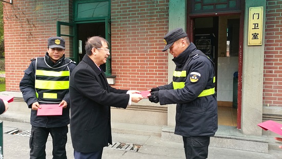 刘宇陆亲切慰问了徐汇校区总值班室、门卫室、监控室、宿舍管理服务部、修缮装潢服务部、食堂等部门春节加班的工作人员。