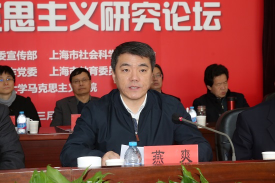 燕爽在讲话中指出,举办本次论坛的目的就是要更好地学习、贯彻、研究和阐释习近平总书记在全国高校思想政治工作会议上的重要讲话精神。他指出,马克思主义论坛在上海马克思主义理论教育教学和研究中已经成为了一个品牌,对推动马克思主义理论学科建设、推动本市各高校马克思主义学院之间的学术交流、协同创新和整体发挥水平起到了重要作用。他强调,我们要始终以培养人为核心,要围绕学生的所思所想解疑释惑,要关心学生的思想状况和价值取向,服务学生的发展和价值追求,要不断改善思想政治理论课教育水平,不断提高学生政治觉悟、道德品质和文化素养。