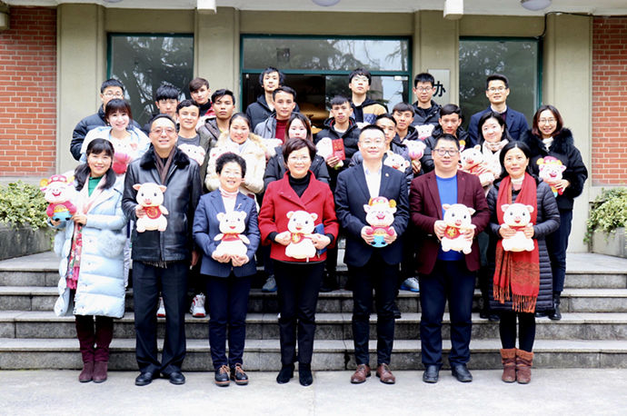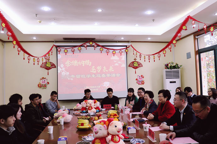 2月2日下午,学校在徐汇校区举办“金猪纳福,逐梦未来”2019年寒假留校学生迎春茶话会。校党委副书记、校长柯勤飞,团市委副书记戴冰出席并致辞,校党委副书记宋敏娟出席。校办主任王占勇、校党委学工部部长袁翔,后勤保障处、学工部及部分学院相关负责人,学生资助管理中心全体人员、部分辅导员及留校学生代表共同参加。
