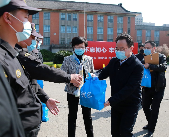 3月20日下午,校党委书记郭庆松、校长柯勤飞亲切看望并慰问我校新冠肺炎疫情防控一线工作人员。