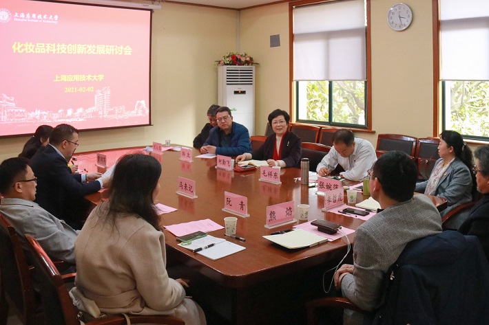 2月2日,学校召开化妆品科技创新发展研讨会,校长柯勤飞主持并讲话,副校长毛祥东、东方美谷企业集团副总经理朱豪君出席。