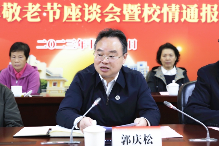 郭庆松向老同志们致以诚挚的问候和衷心的祝福。他详细介绍了今年以来学校事业发展所取得的新进展新成效。他说,老领导、老同志为学校的发展奉献了青春和力量,建立了光辉的业绩,是学校改革创新的开拓者、奠基者、见证者。希望老领导、老同志继续一如既往地关心关注学校的发展,积极建言献策,帮助学校把各项工作做得更加扎实、更富有成效。同时,诚挚邀请老领导、老同志明年相聚,同庆学校建校70华诞。