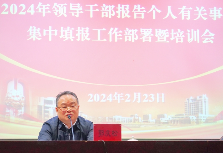 为高质量做好2024年领导干部报告个人有关事项工作,2月23日,学校召开工作部署培训会。校党委书记郭庆松出席会议并讲话,校党委副书记陈海瑾主持会议。